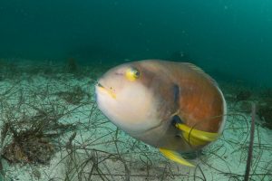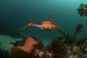 The word on the street was that Bicheno was a good place to spot weedy seadragons, so we headed there for a dive. It was an easy shore dive with lots to see – friendly blue throated wrasse, rocky kelp reef, and indeed about five weedy seadragons. We felt strangely at home because it reminded us of one of our favourite shore dives in Sydney, Shelly Beach. As a bonus, above water we saw a bird we had never seen before, a musk parrot.